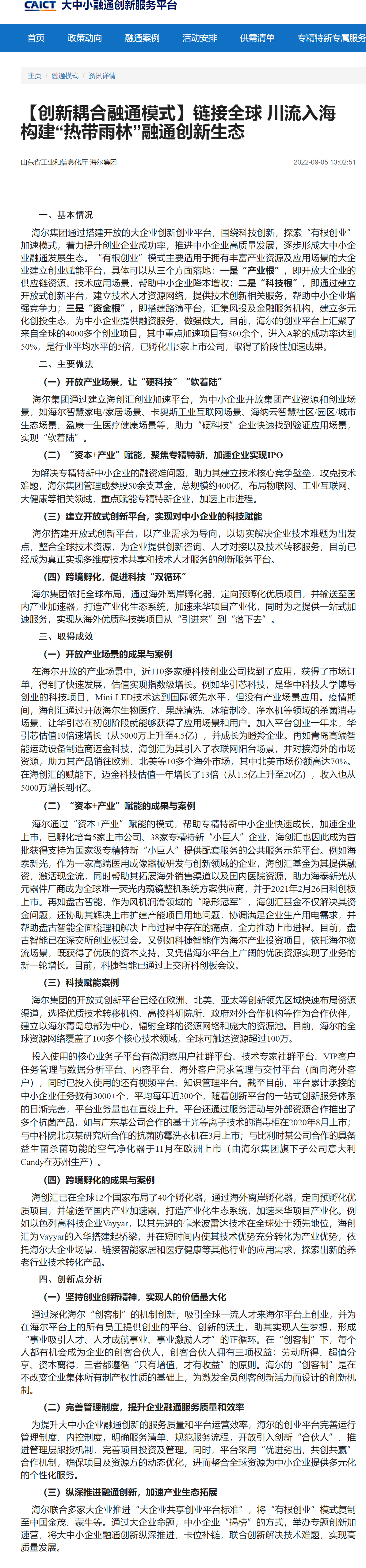 近日,中国信通院发布《大中小企业融通创新典型模式案例集(2022年)》, 海尔集团“创业耦合融通”模式入选并在全国范围内推广。