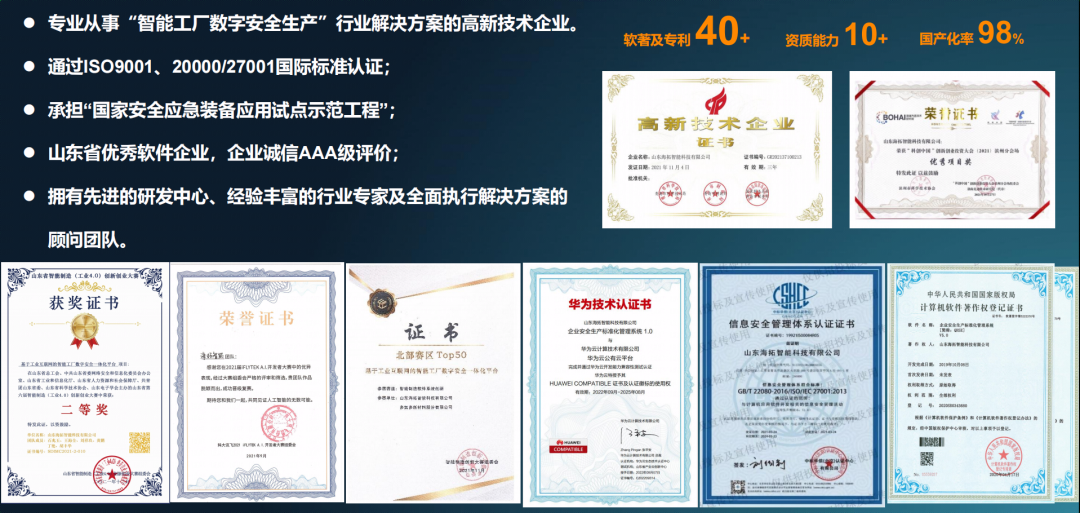 公司符合GB/T19001-2016质量体系标准要求,产品符合ANSI/ISA95、ISO27001国际标准,拥有30余项软件著作权、软件认定产品证书及多项专利,参与并完成多项应急管理部、省市级相关课题,承担了“国家应急装备示范试点工程”项目。