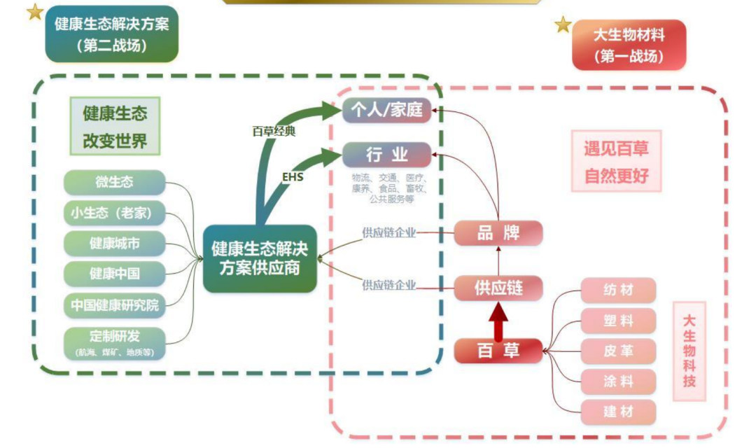 利用大生物材料及健康生态解决方案两大业务板块,打造健康城市、 为行业提供健康生态解决方案。