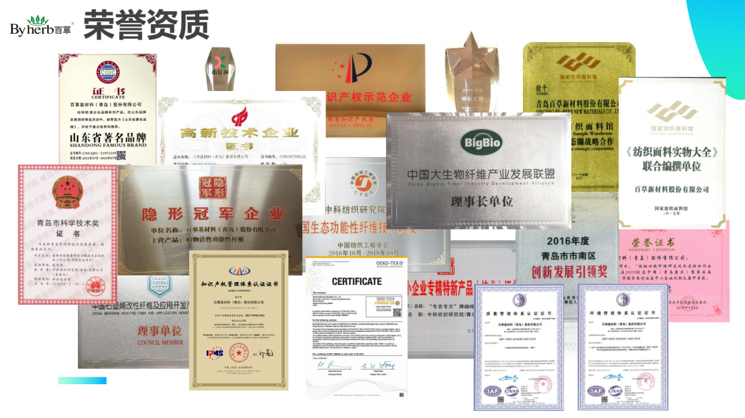 近十年来,在国家纺织工程学会大力支持下,与中国纺织科学研究院、中国中医科学院,以及天津工业大学、大连理工大学、东华大学、青岛大学等国家科研院所长期战略合作,国家纺织工程学会在公司设立认定了“全国生态功能性纤维技术研发中心”,先后推出的“百草薄荷、百草草珊瑚”等十几种系列专利纤维产品,百草薄荷(专利号2239583)、百草草珊瑚(专利号1997845)、百草罗布麻(专利号1998251)等系列植物纤维产品,广泛应用于内衣、婴童服、孕妇装、家居服、牛仔、家纺、美妆等多个面料纺织服装领域,推动替代化学功能面料、絮片,与英氏、罗莱家纺、都市丽人、皮尔.卡丹、爱慕、梦洁、安踏、浪莎集团等国内品牌已经广泛合作。