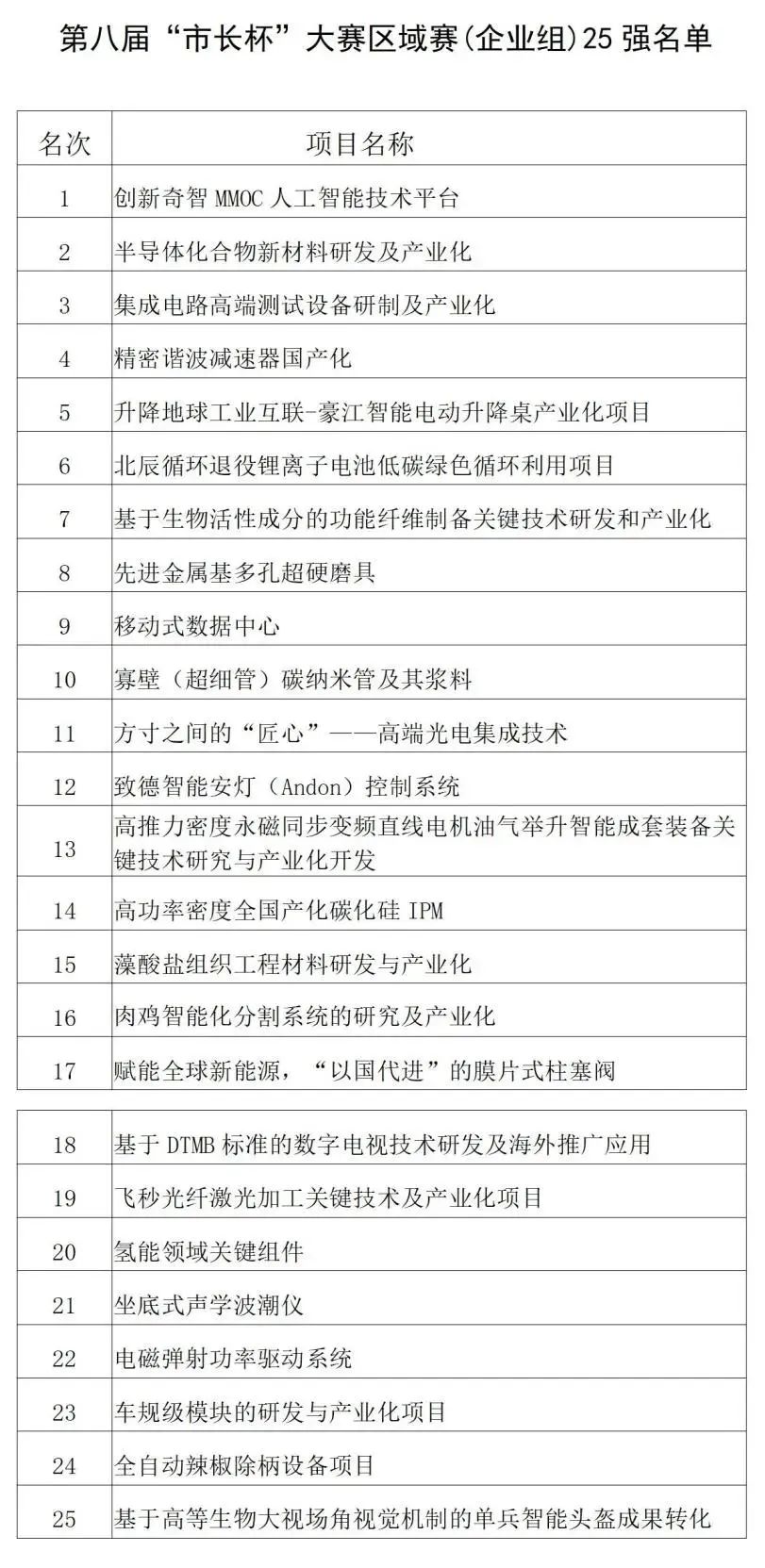 附件:第八届“市长杯”大赛区域赛(企业组)25强名单