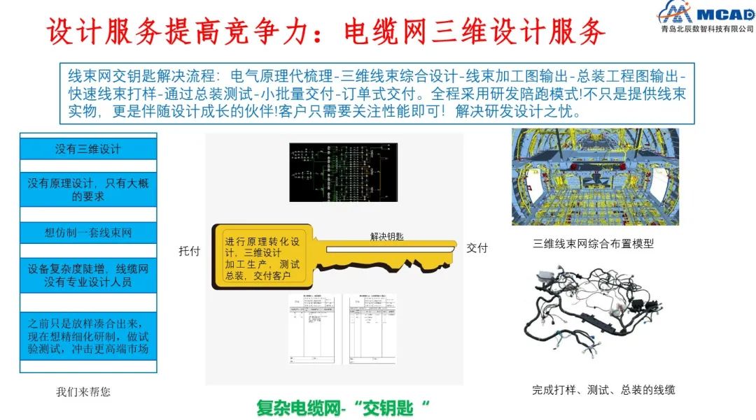 主要开展航空航天、高端装备的数字化设计业务为主,开展半委托或全委托“交钥匙”模式的计业务,以电缆网设计最多,一般到可以直接交付生产,也可根据需求实现快速小批量定制生产